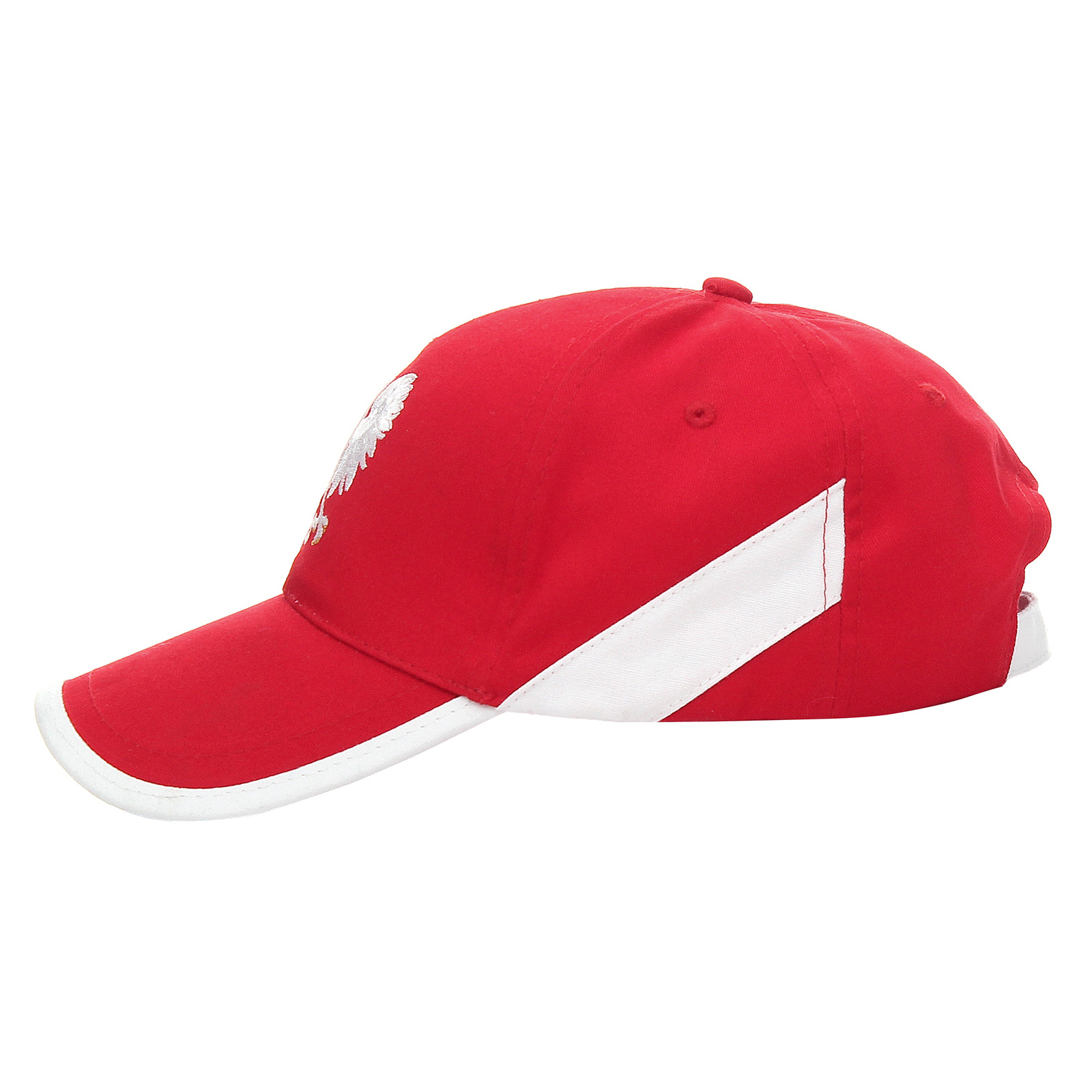 Wyhaftowany biały orzeł. Wykończenie brzoskwiniowe materiału. Daszek wykończony białą lamówką. Boczne wstawki w białym kolorze; zapięcie regulowane metalową sprzączką. 6 paneli. Usztywnienie przedniego panelu. Obszyte wywietrzniki.