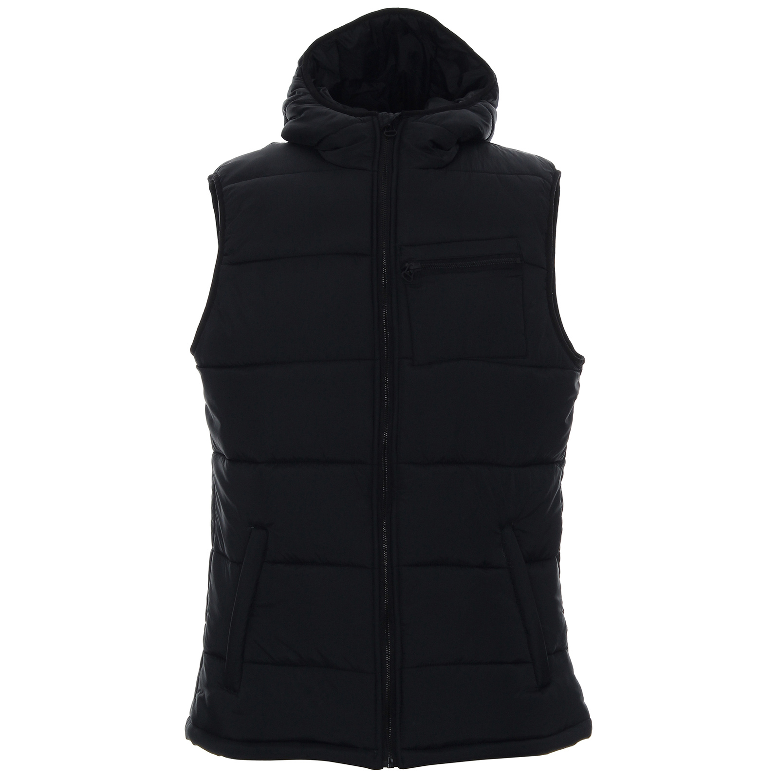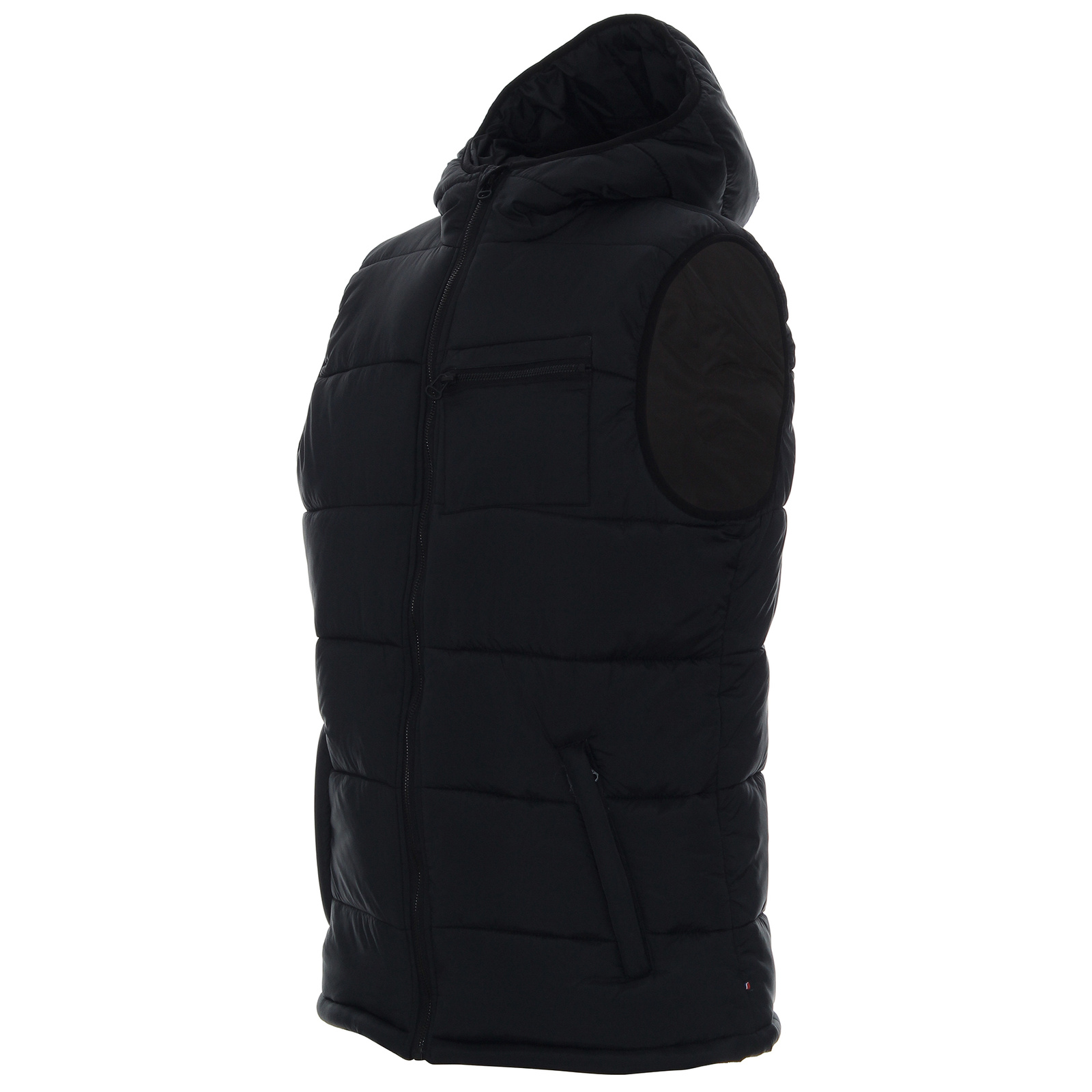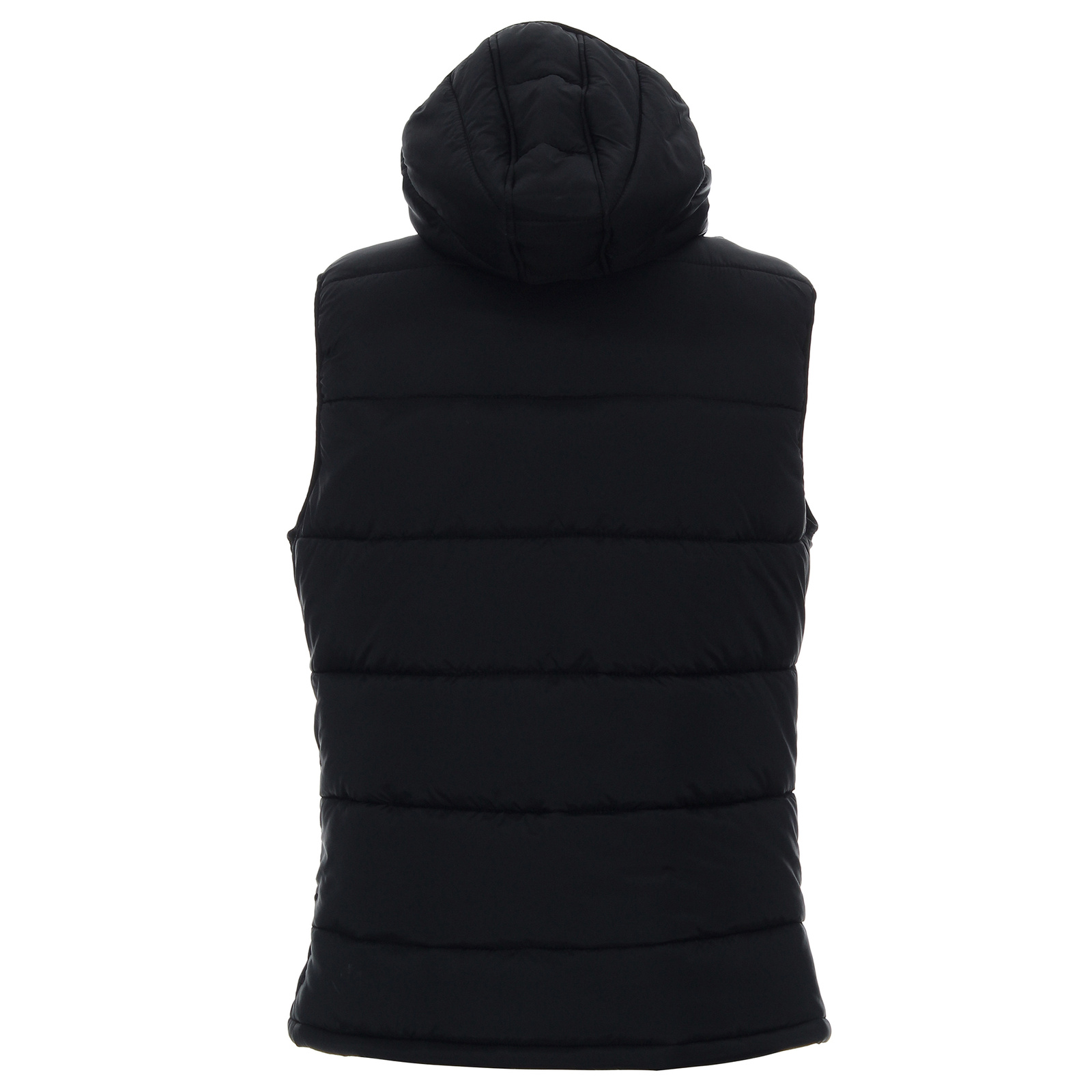 Kołnierz ze stójką. Materiał typu rip stop. Wnętrze kamizelki wyścielone podszewką. Kaptur wyścielony materiałem głównym. Naszyta kieszeń na lewej piersi. Wysokiej jakości, metalowy zamek główny i kieszeni na piersi. Kieszenie boczne zamykane na zamki nylonowe. Kaptur i pachy wykończone elastyczną taśmą. Dół kamizelki rozpinany od wewnątrz na zamek umożliwiajacy dojście maszyny znakującej.