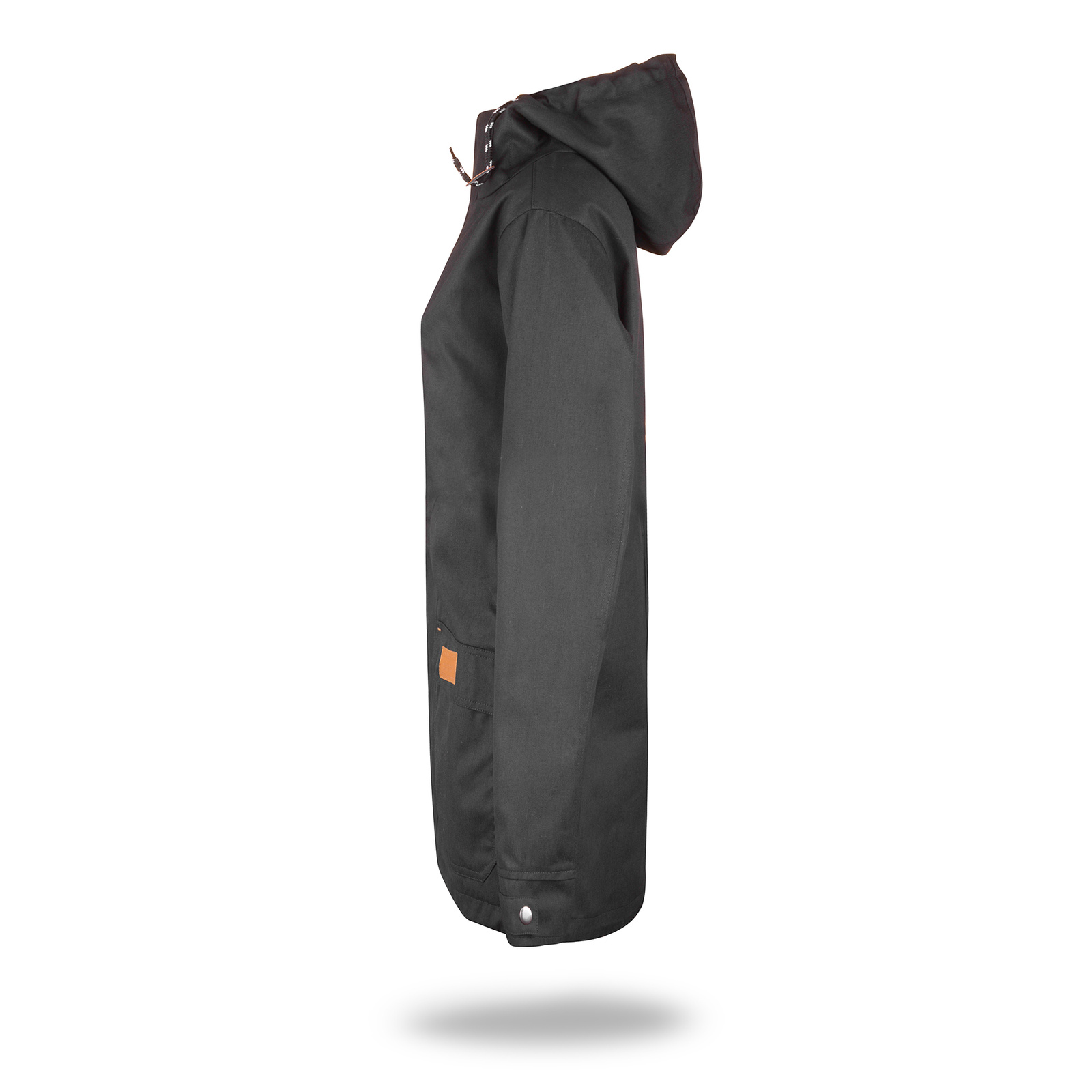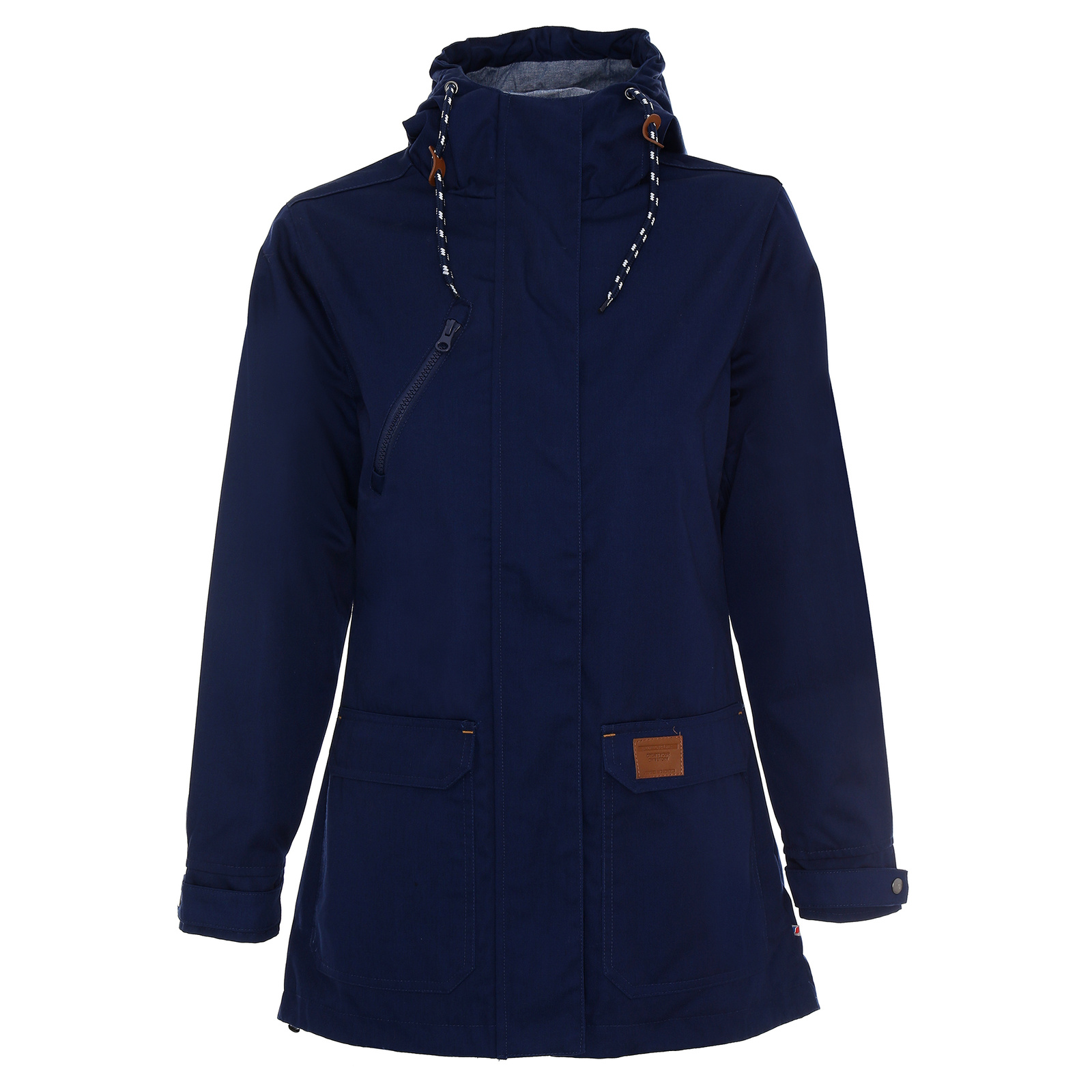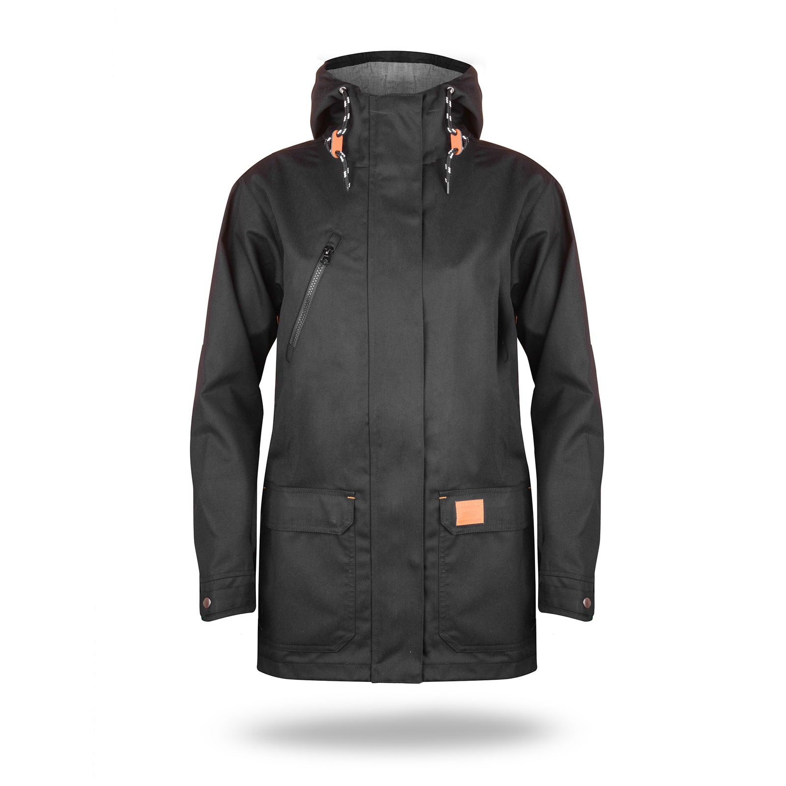 Materiał typu twill. Kaptur wyścielony kontrastowym materiałem typu oxford. Wnętrze wyścielone podszewką wykonaną z materiału typu taffeta. Kołnierz ze stójką. Kostkowy zamek główny oraz kieszeni na piersi. Zamek główny kryty listwą zapinaną na zatrzaski. Podwójne kieszenie dolne. Wewnątrz kieszeń na dokumenty zamykana na rzep. Ozdobny sznurek w regulacji kaptura. Ozdodne drobne elementy skórzane. System ściągaczy u dołu wewnątrz. Dół rozpinany od wewnątrz na zamek umożliwiający dojście maszyny znakującej. Wykończenie water-repellent zapobiegające osiadaniu wody.