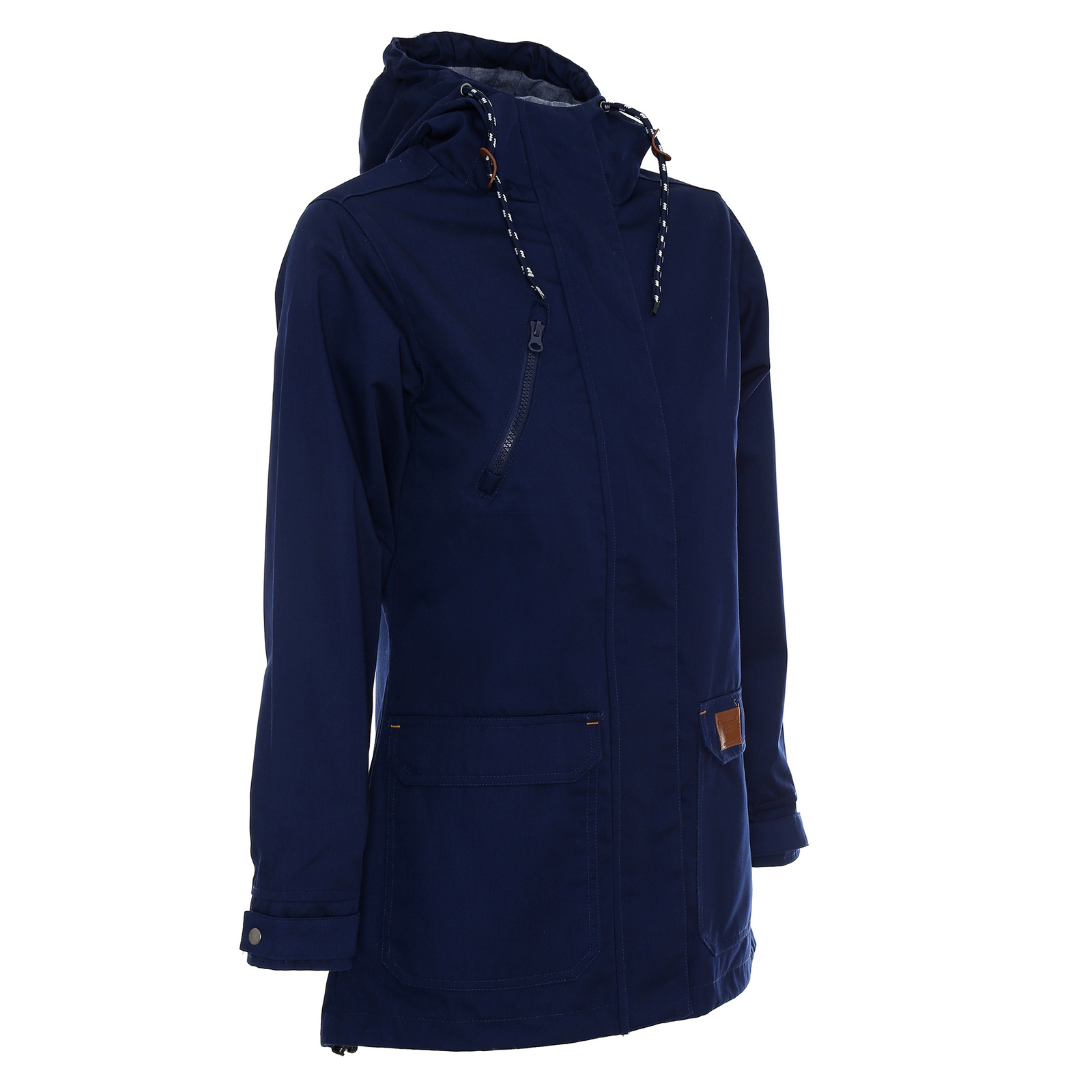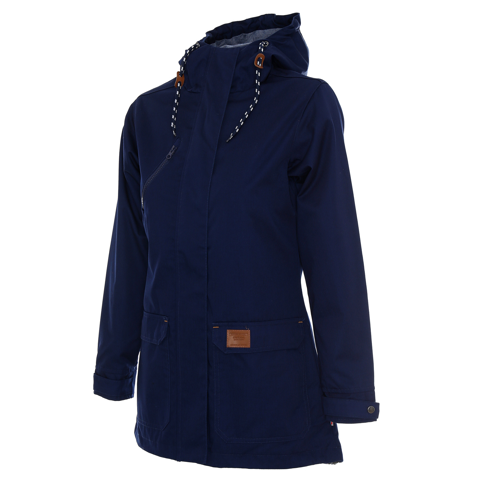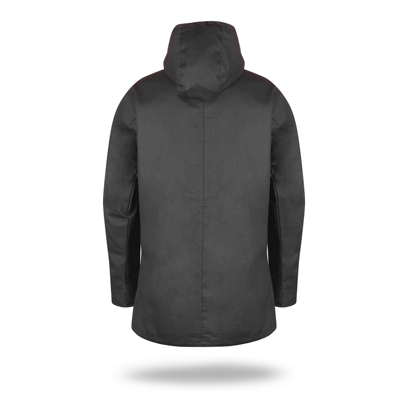 Materiał typu twill. Kaptur wyścielony kontrastowym materiałem typu oxford. Wnętrze wyścielone podszewką wykonaną z materiału typu taffeta. Kołnierz ze stójką. Kostkowy zamek główny oraz kieszeni na piersi. Zamek główny kryty listwą zapinaną na zatrzaski. Podwójne kieszenie dolne. Wewnątrz kieszeń na dokumenty zamykana na rzep. Ozdobny sznurek w regulacji kaptura. Ozdodne drobne elementy skórzane. System ściągaczy u dołu wewnątrz. Dół rozpinany od wewnątrz na zamek umożliwiający dojście maszyny znakującej. Wykończenie water-repellent zapobiegające osiadaniu wody.