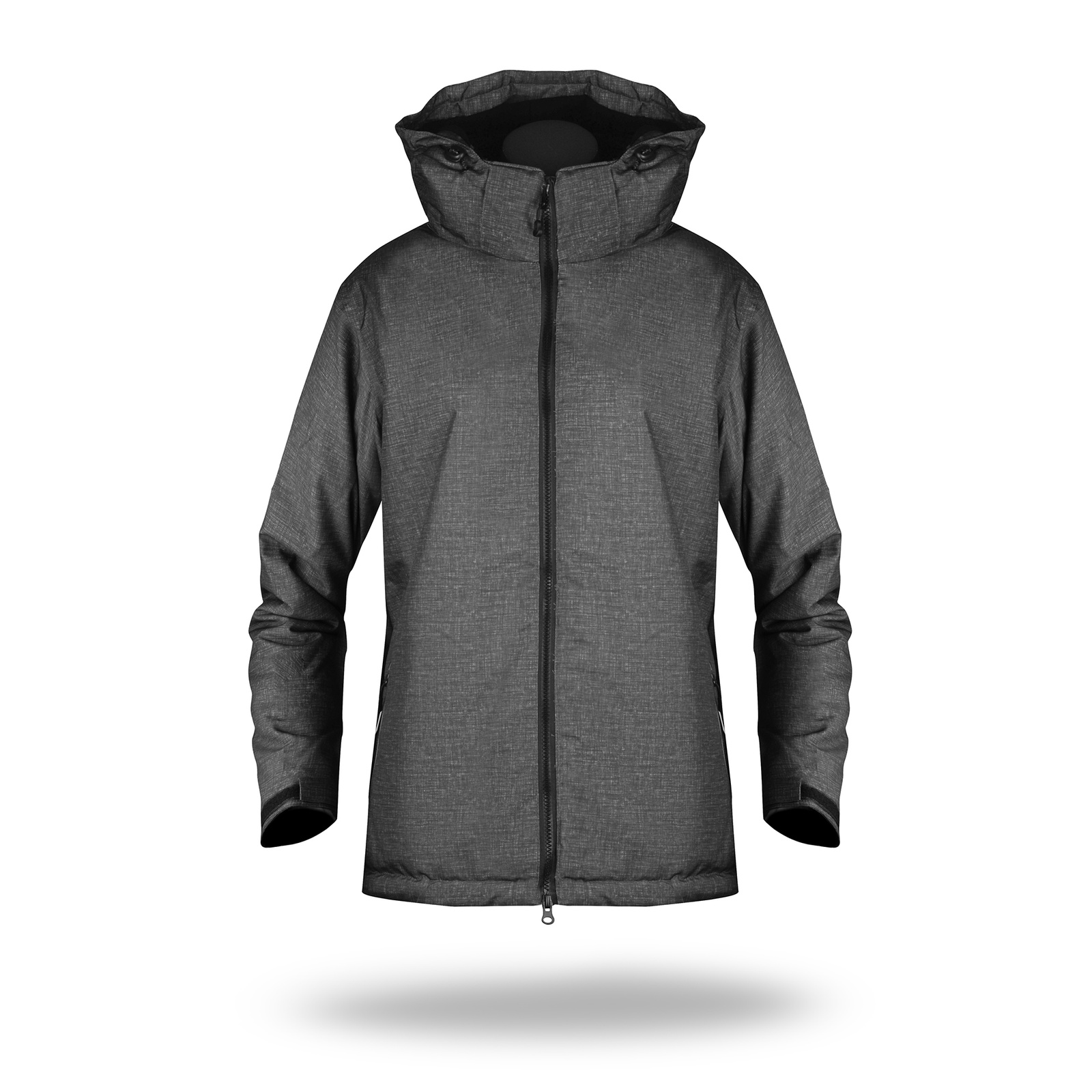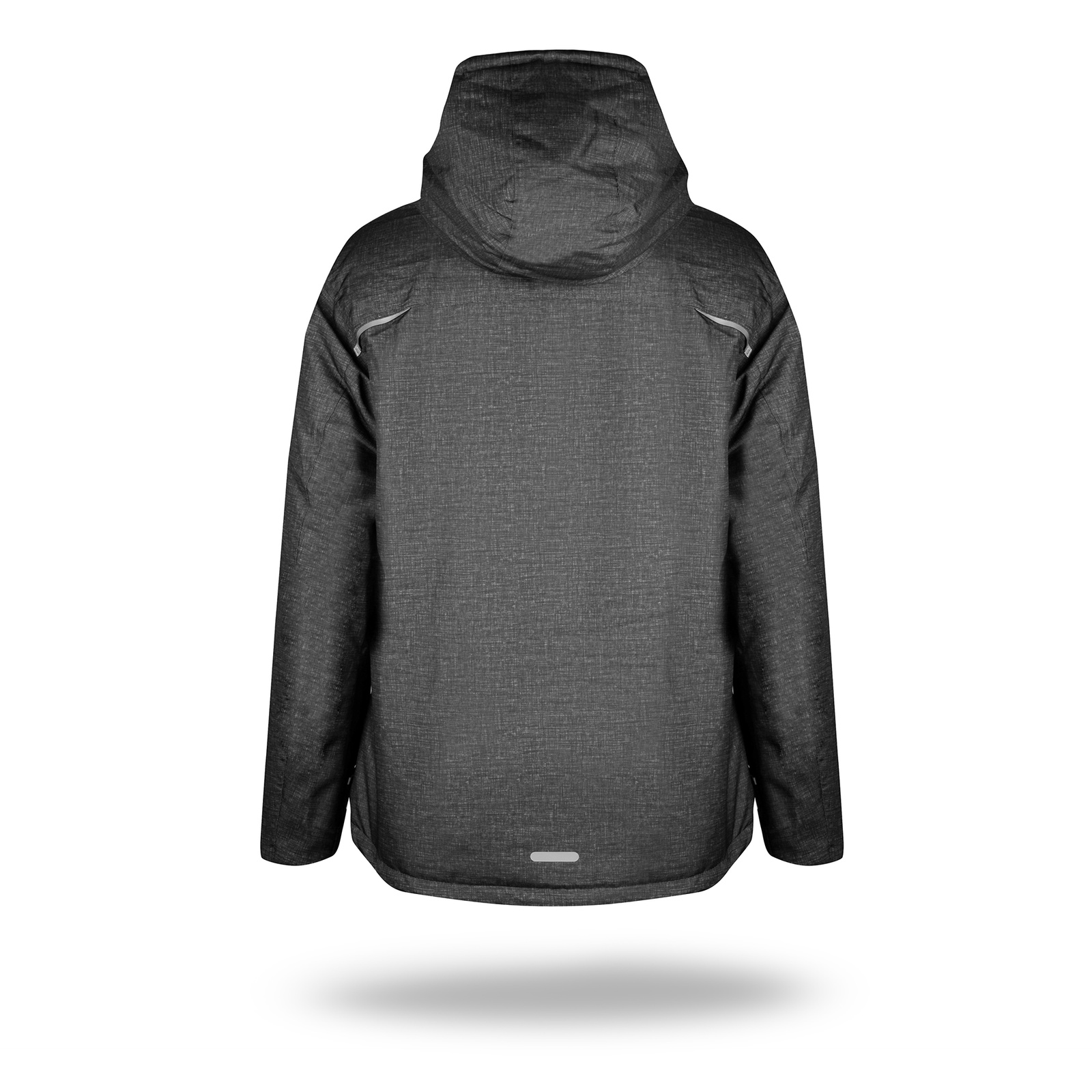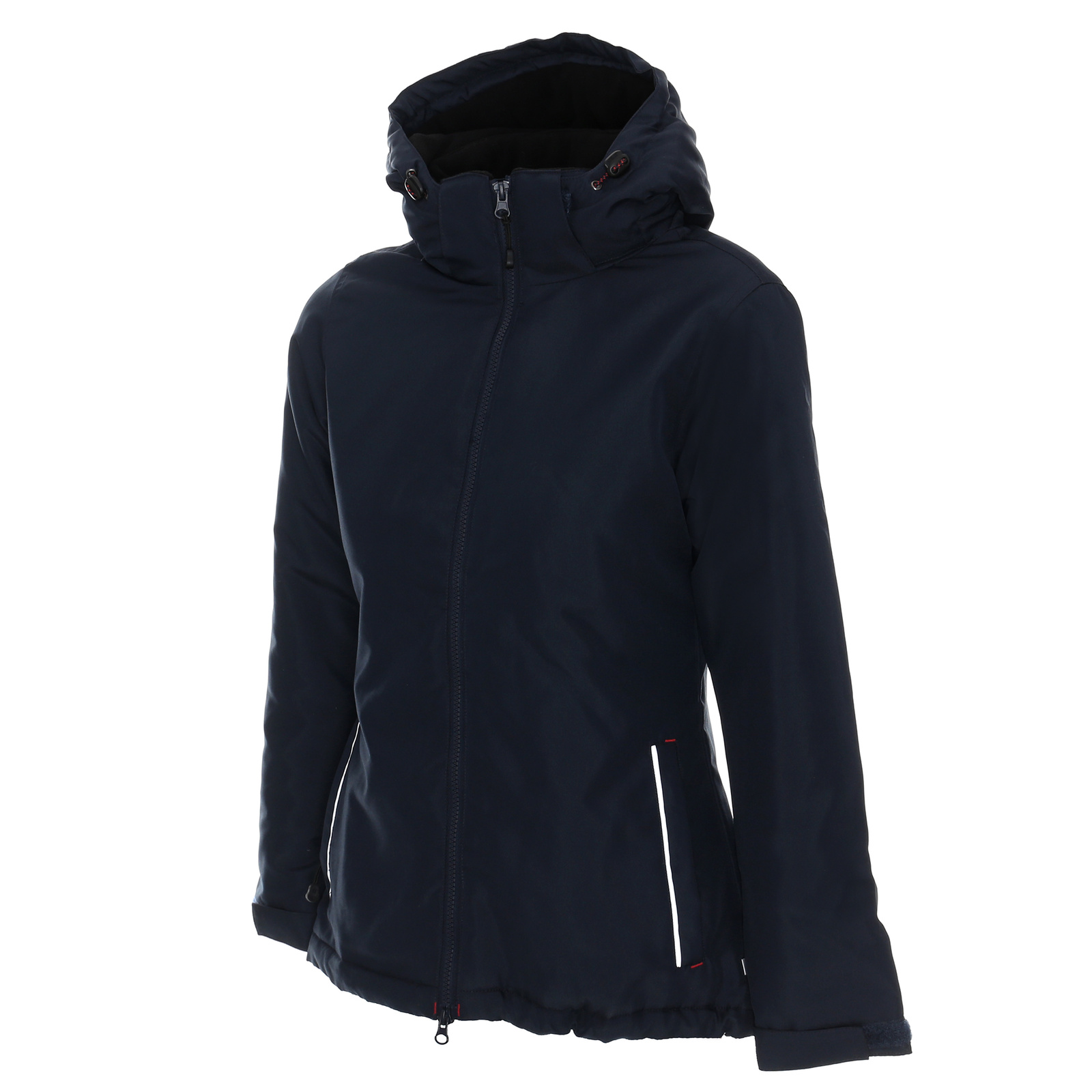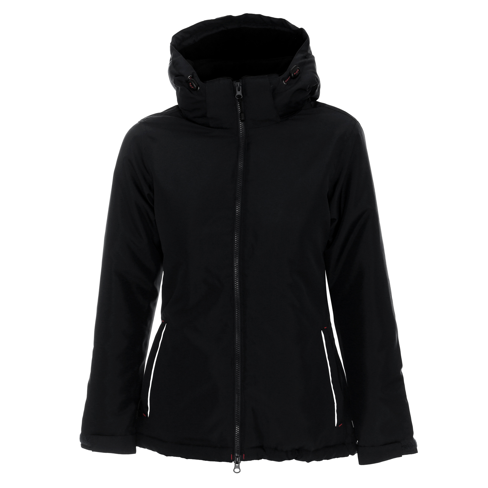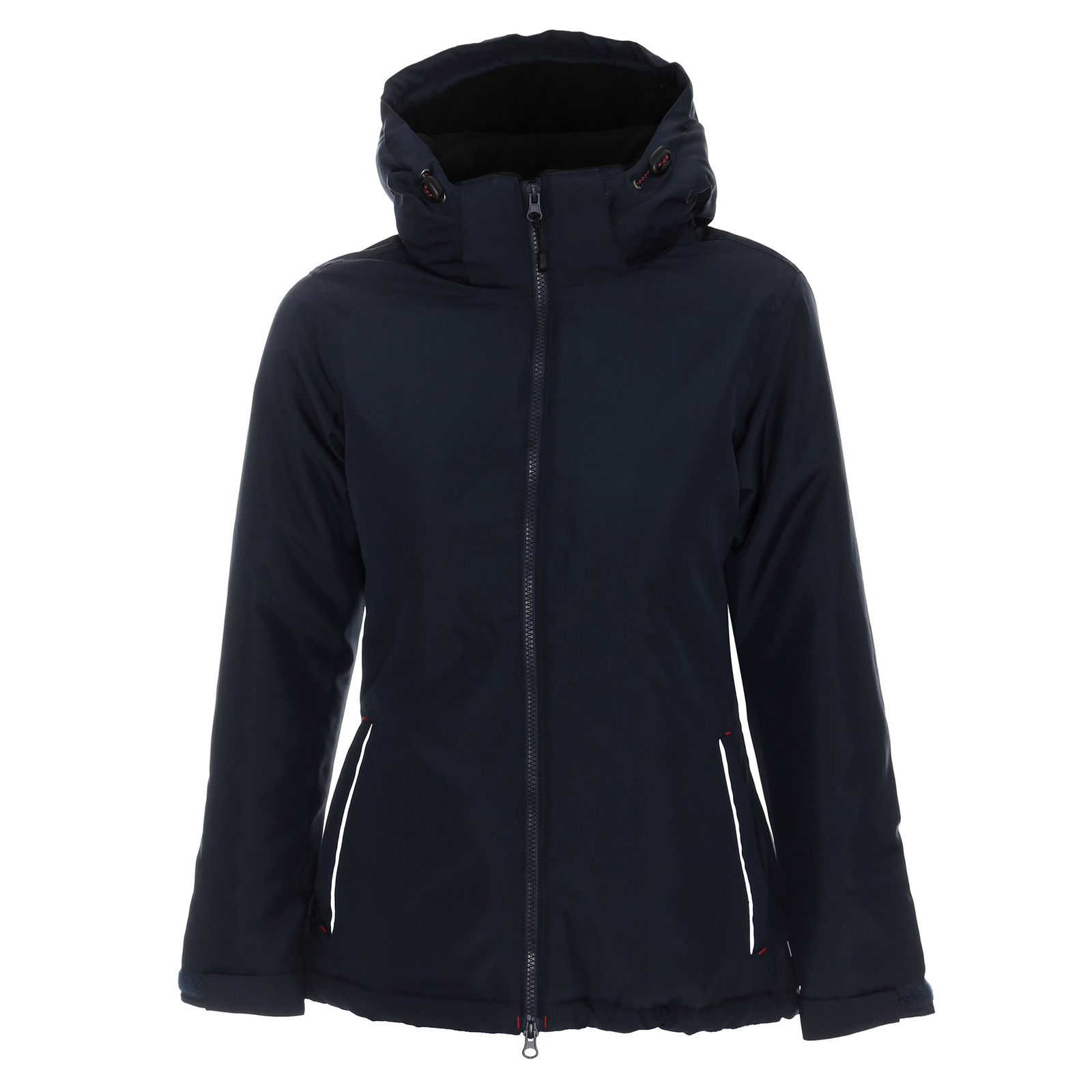 Materiał typu oxford. Wnętrze kurtki wyścielone podszewką wykonaną z materiału typu taffeta. Wnętrze kaptura i stójki kołnierza wyłożone polarem. Odpinany kaptur na zamek. System ściągaczy w regulacji kaptura i u dołu wewnątrz. Zamek główny kostkowy. Dwie zewnętrzne kieszenie zamykane na zamek nylonowy. mankiety z regulacją na rzep. Elementy odblaskowe z przodu i z tyłu. Dekoracyjne przeszycia. Dół rozpinany od wewnątrz na zamek umożliwiajacy dojście maszyny.
