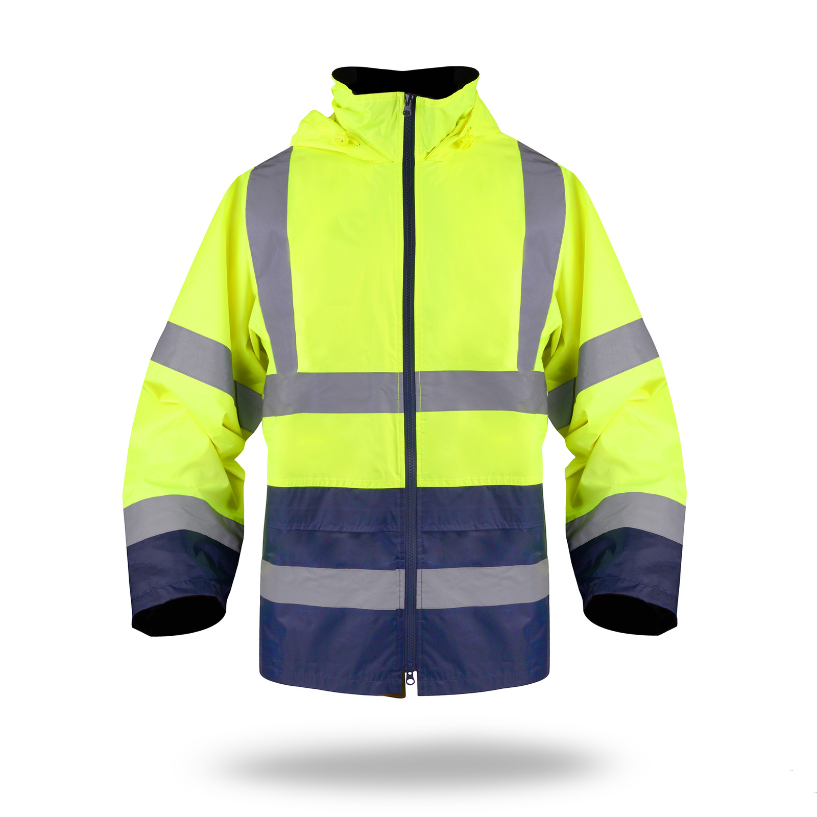 Dwukolorowa przeciwdeszczowa kurtka ostrzegawcza.