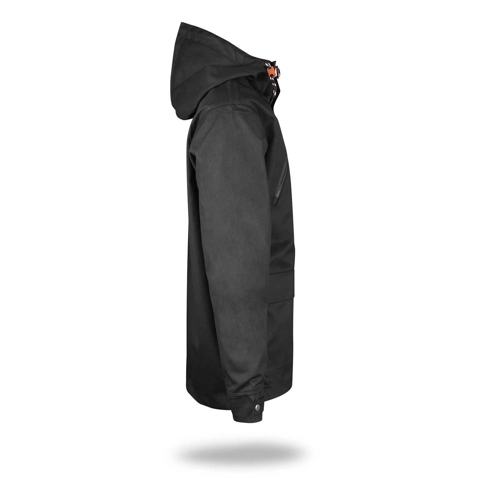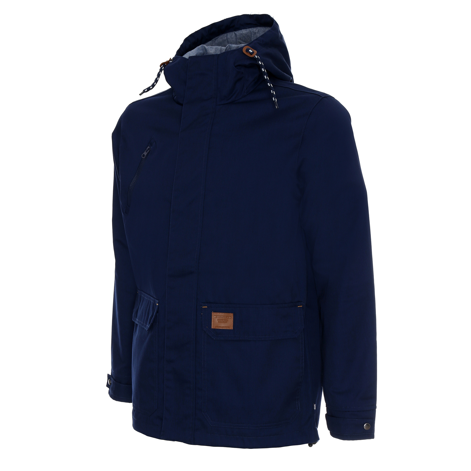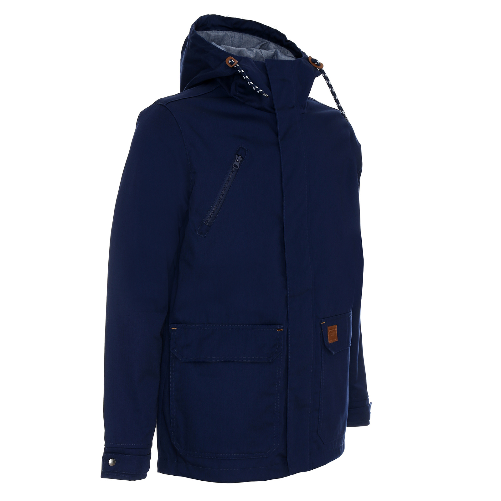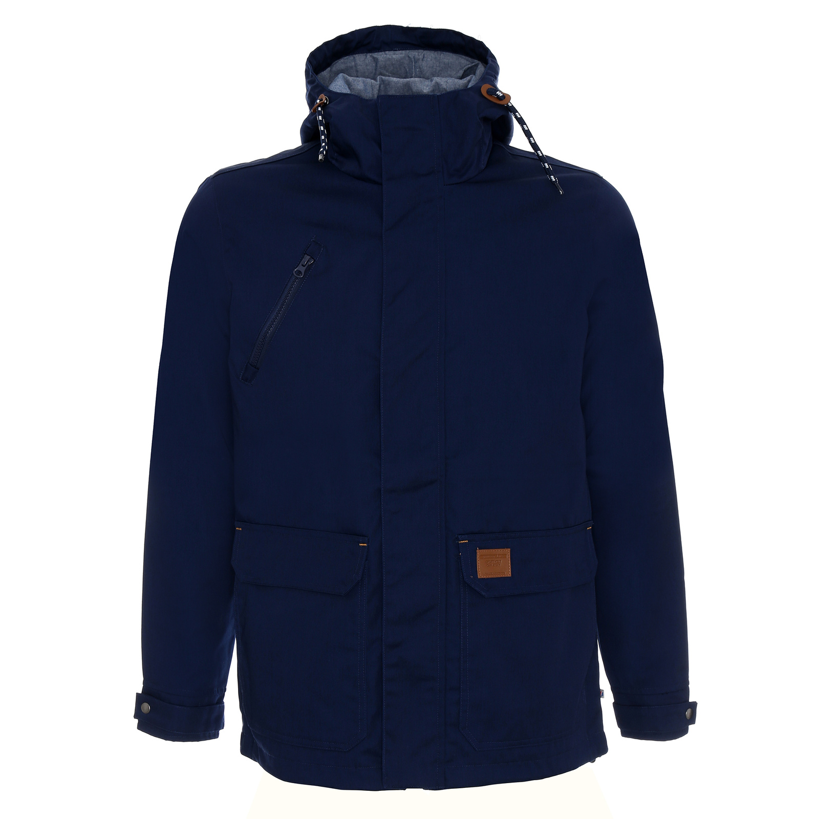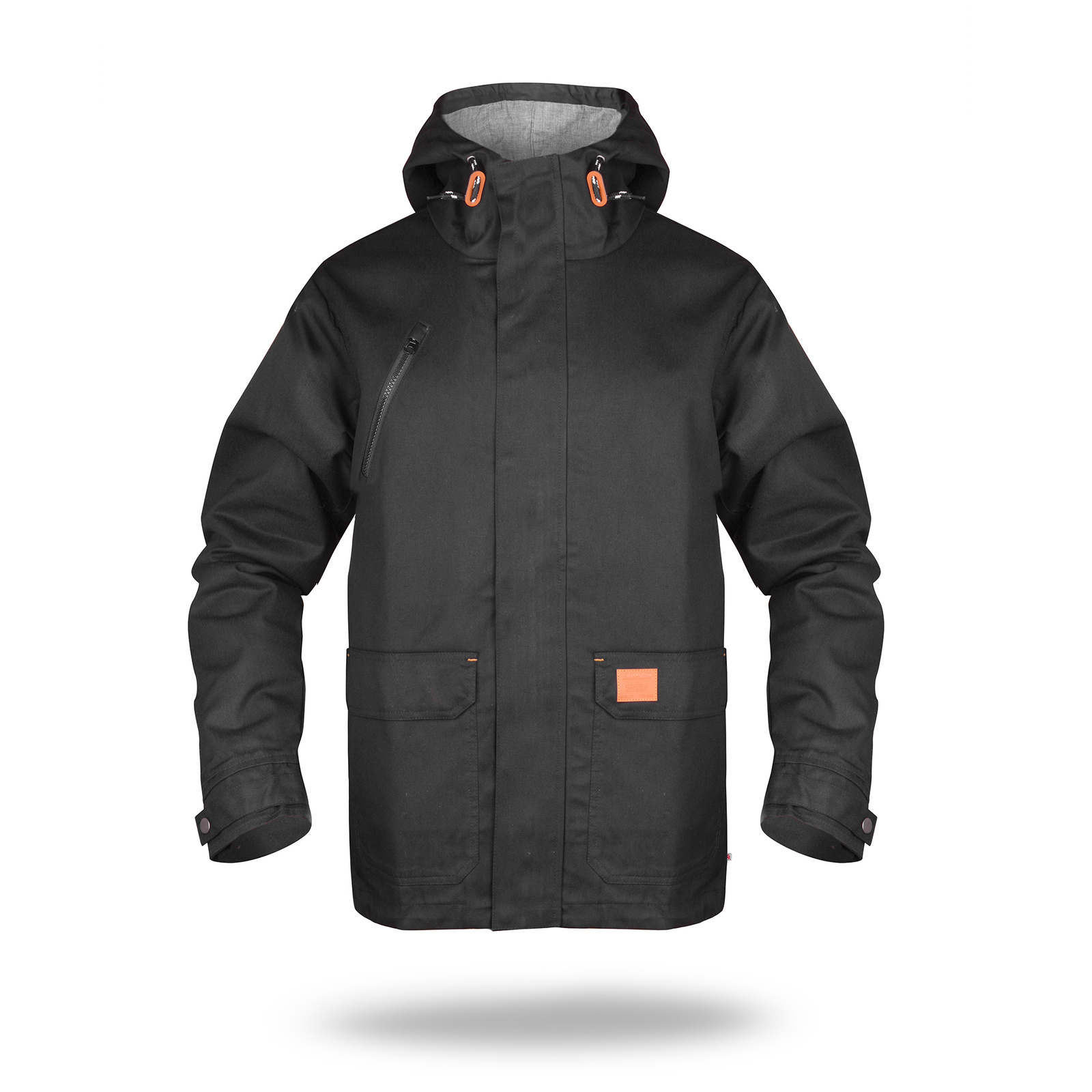 Materiał typu twill. Kaptur wyścielony kontrastowym materiałem typu oxford. Wnętrze wyścielone podszewką wykonaną z materiału typu taffeta. Kołnierz ze stójką. Kostkowy zamek główny oraz kieszeni na piersi. Zamek główny kryty listwą zapinaną na zatrzaski. Podwójne kieszenie dolne. Wewnątrz kieszeń na dokumenty zamykana na rzep. Ozdobny sznurek w regulacji kaptura. Ozdodne drobne elementy skórzane. System ściągaczy u dołu wewnątrz. Dół rozpinany od wewnątrz na zamek umożliwiający dojście maszyny znakującej. Wykończenie water-repellent zapobiegające osiadaniu wody.