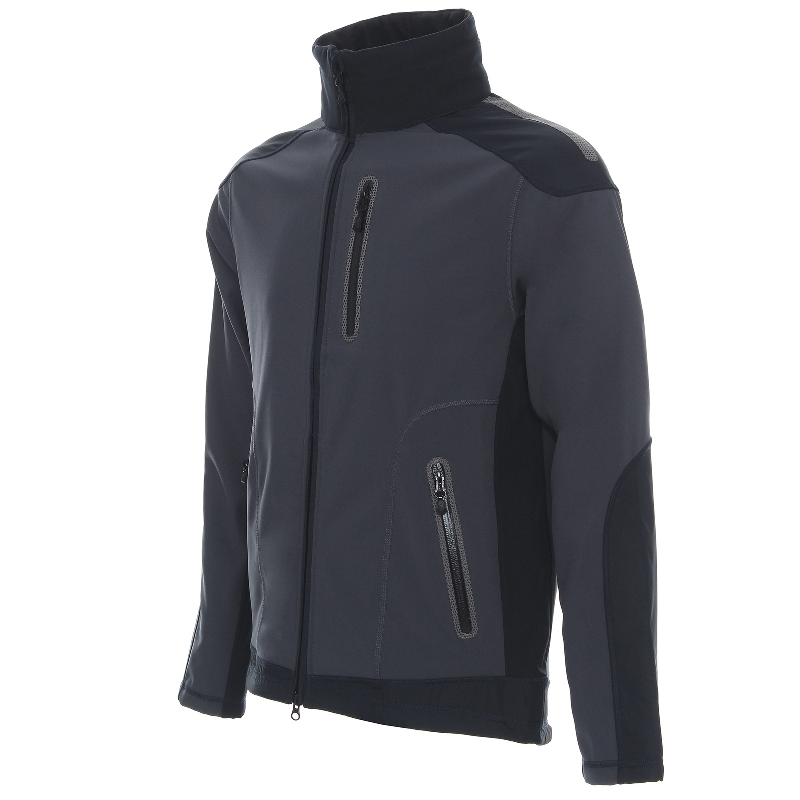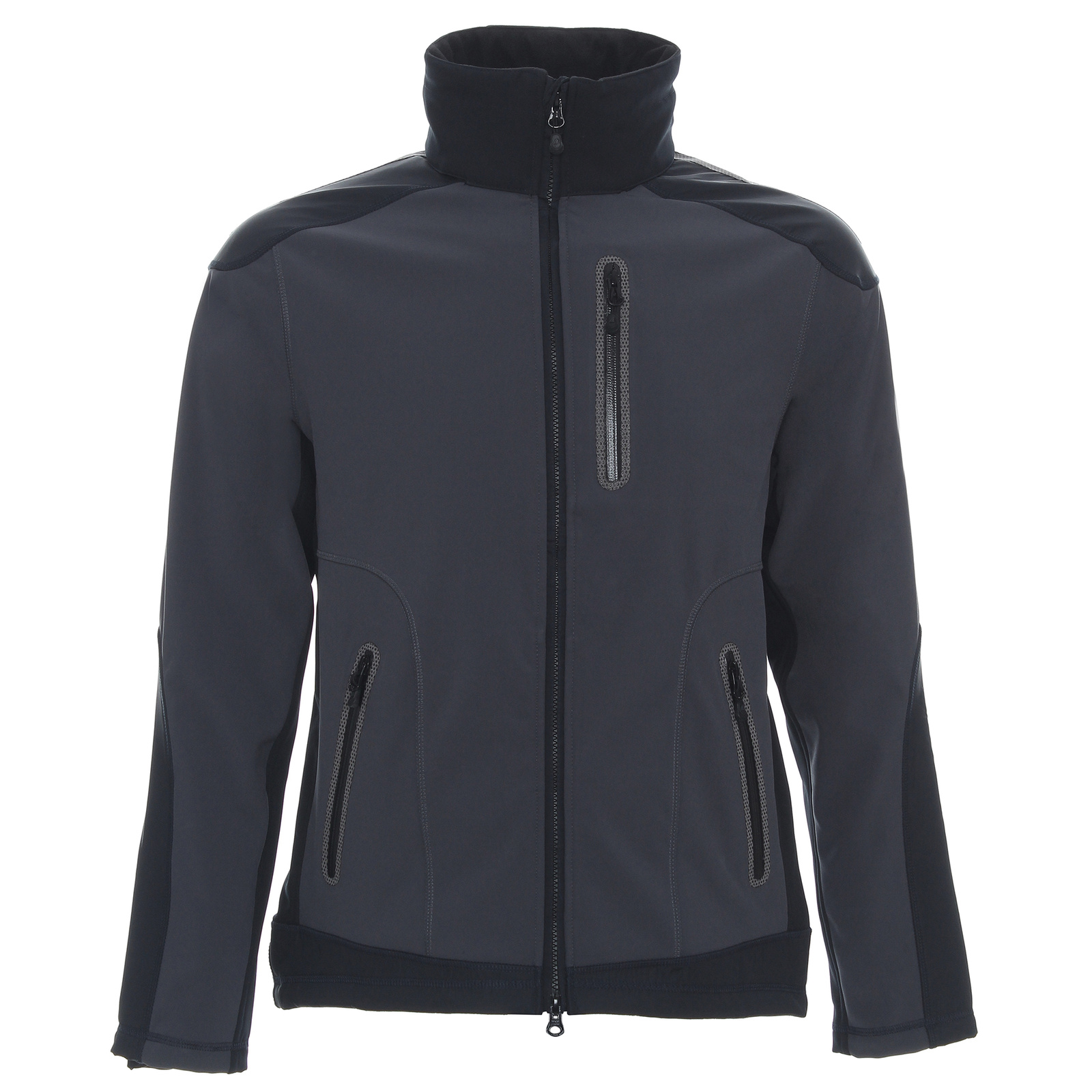 Materiał typu softshell połączony z mikropolarem. Na ramionach i przy zamkach kieszeni wstawki ozdobnego gumowanego materiału. Wydłużony tył. Kołnierz ze stójką. Kaptur chowany w stójce zapinanej na rzep. System ściągaczy w regulacji stójki kołnierza i u dołu wewnątrz. System 4 wywietrzników pod pachą. Mankiety połączone z elastycznym materiałem z otworem na kciuk. Zamek główny kostkowy, plastikowy. Trzy zewnętrzne kieszenie zamykane na wodoodporny suwak. Markowe zamki YKK. Wewnątrz mała kieszeń zamykana na rzep. Dekoracyjne przeszycia, wodoodporność: 8000 mm słupa wody; oddychalność: 8000 g/m2/24h.
