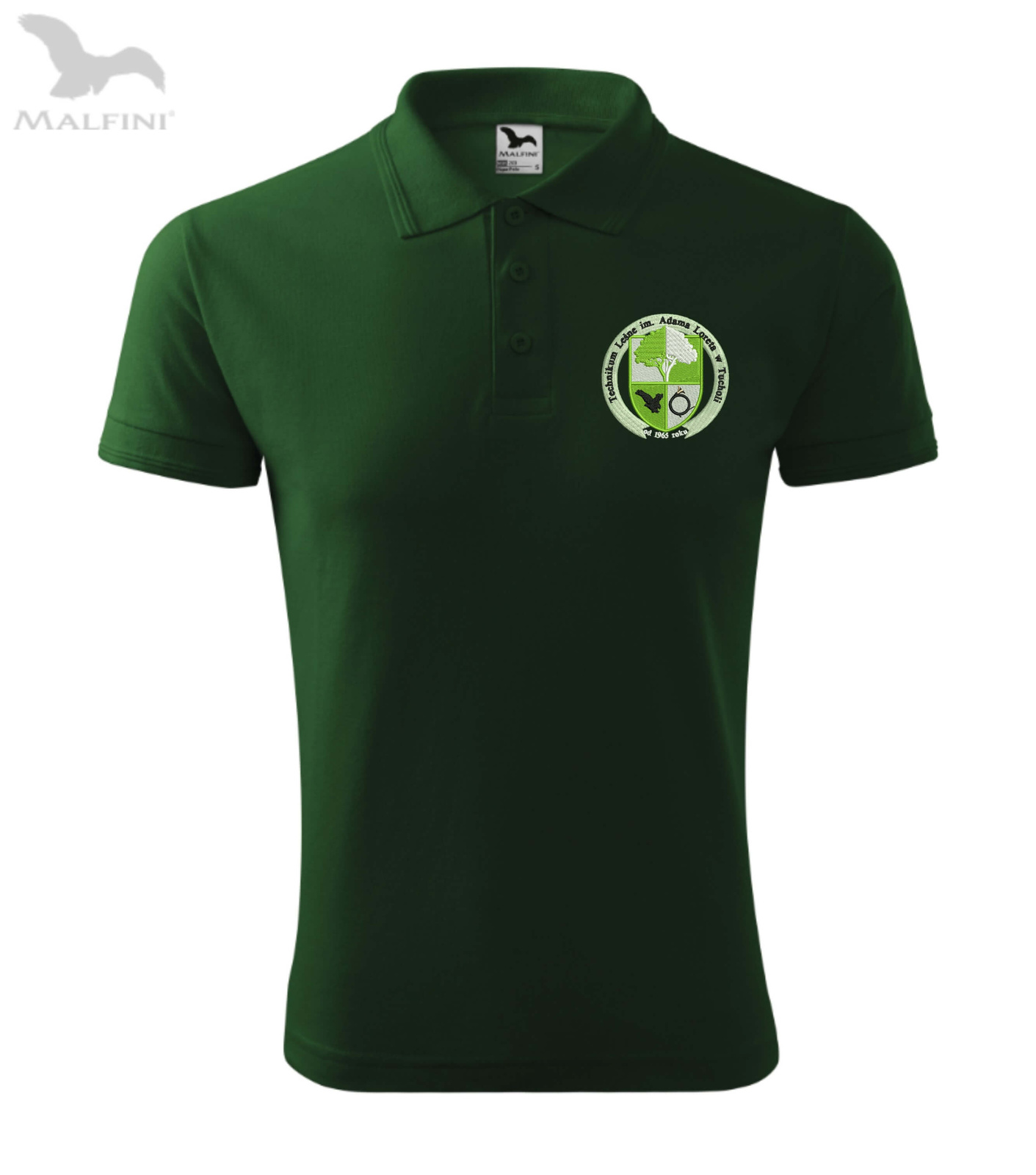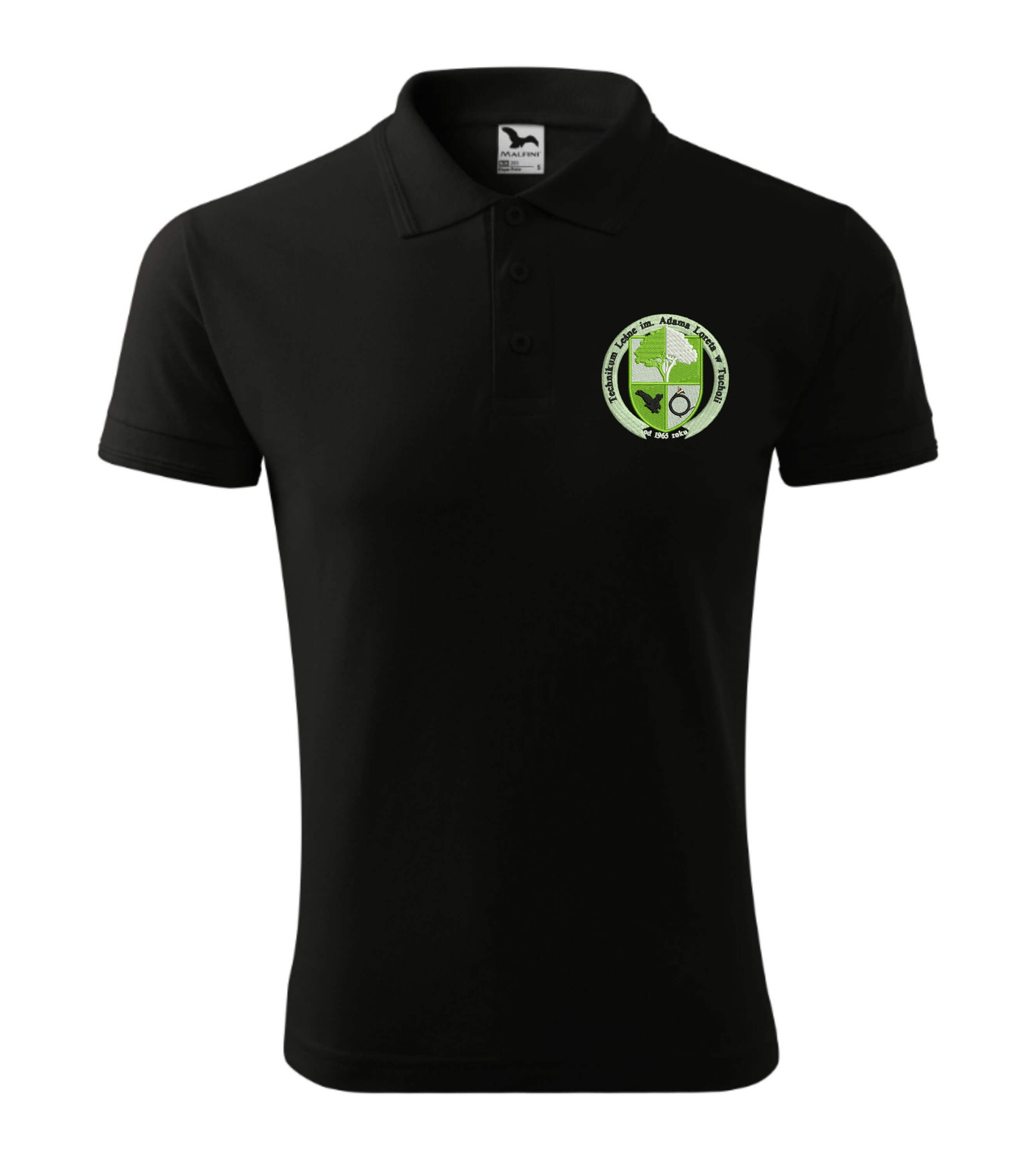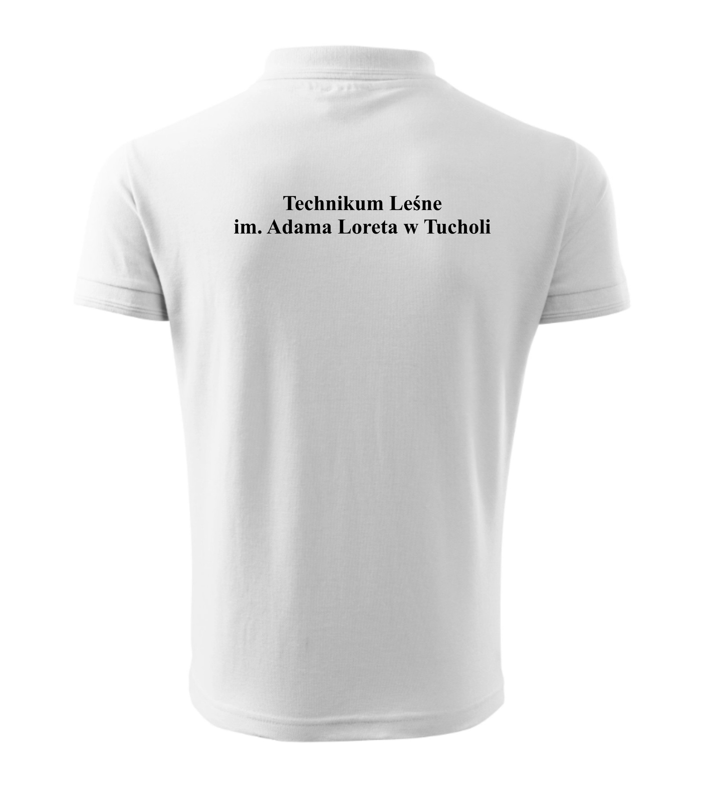 Męska koszulka polo z haftowanym herbem szkoły i napisami na plecach. Technikum Leśne im. Adama Loreta w Tucholi.