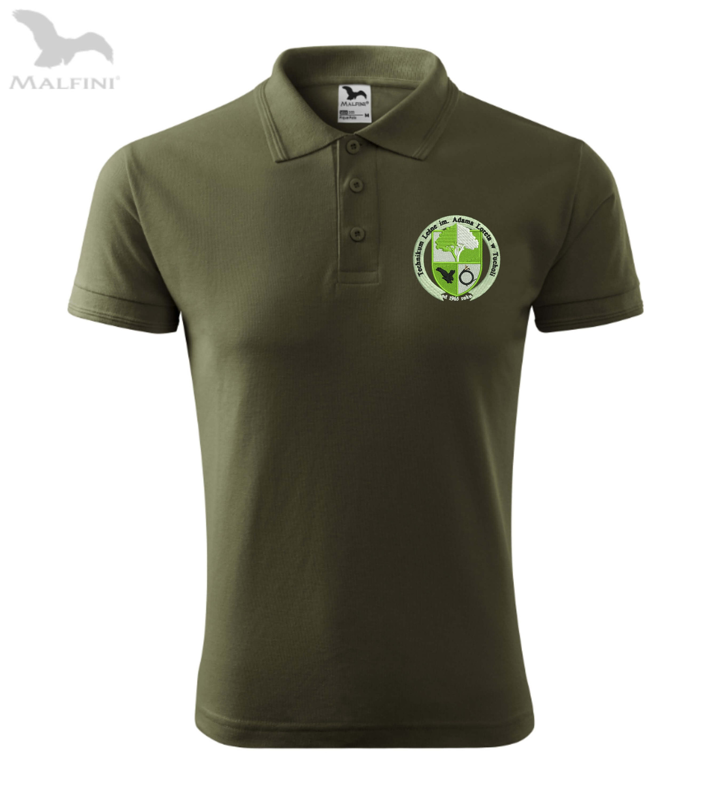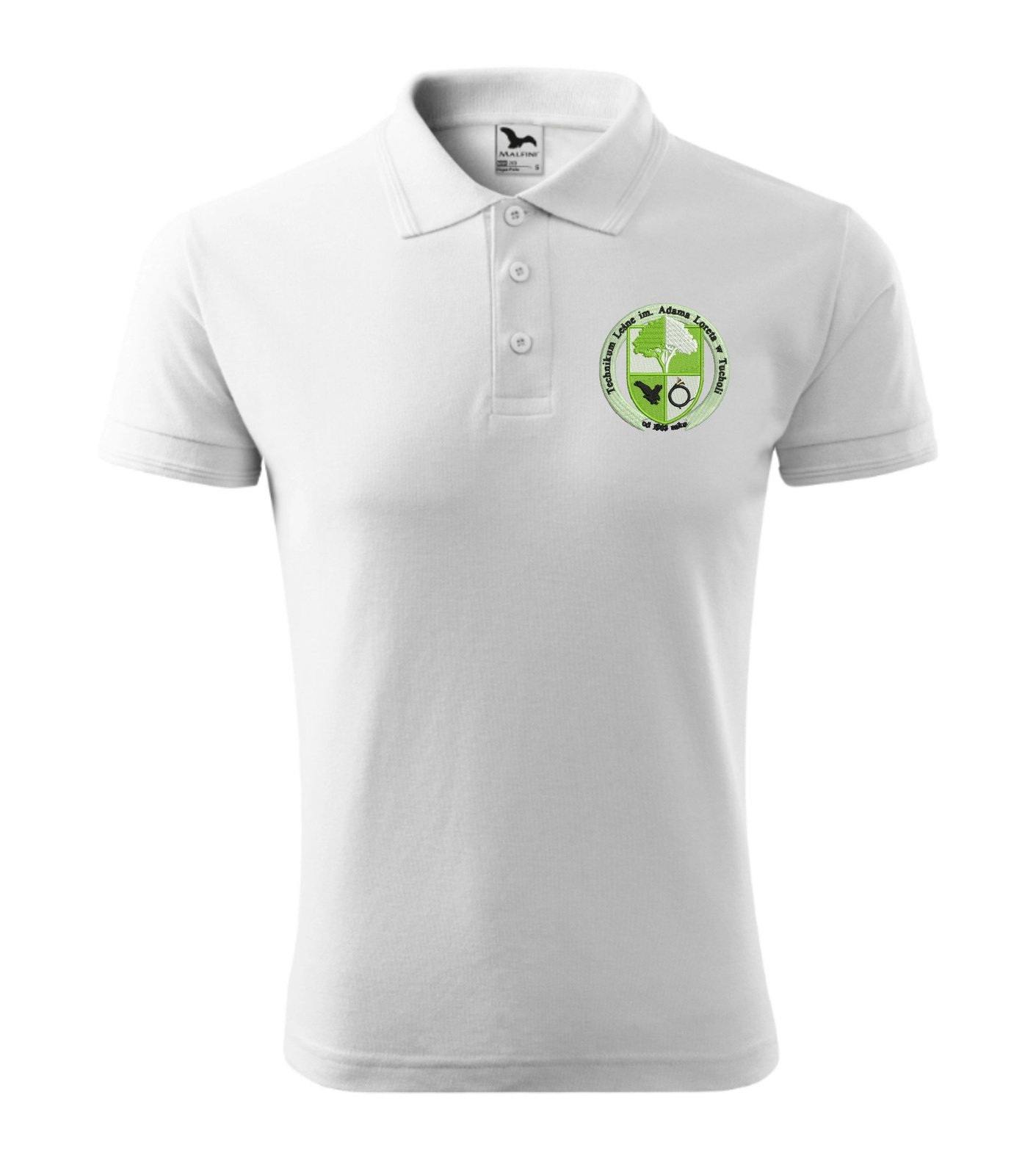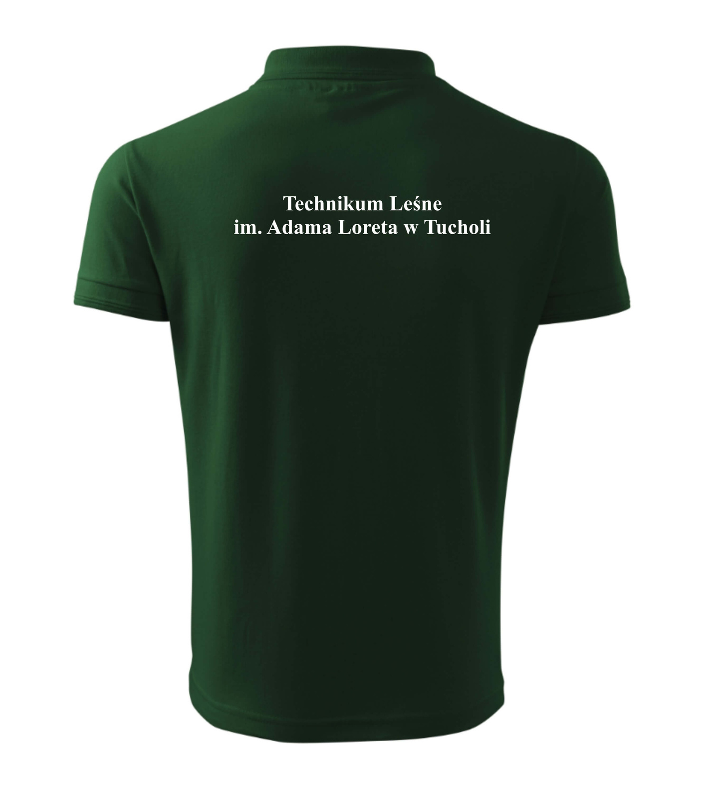 • Męska koszulka polo z haftowanym herbem szkoły i napisami na plecach. Technikum Leśne im. Adama Loreta w Tucholi.